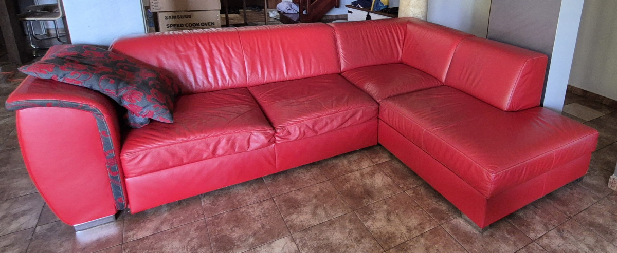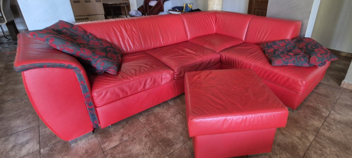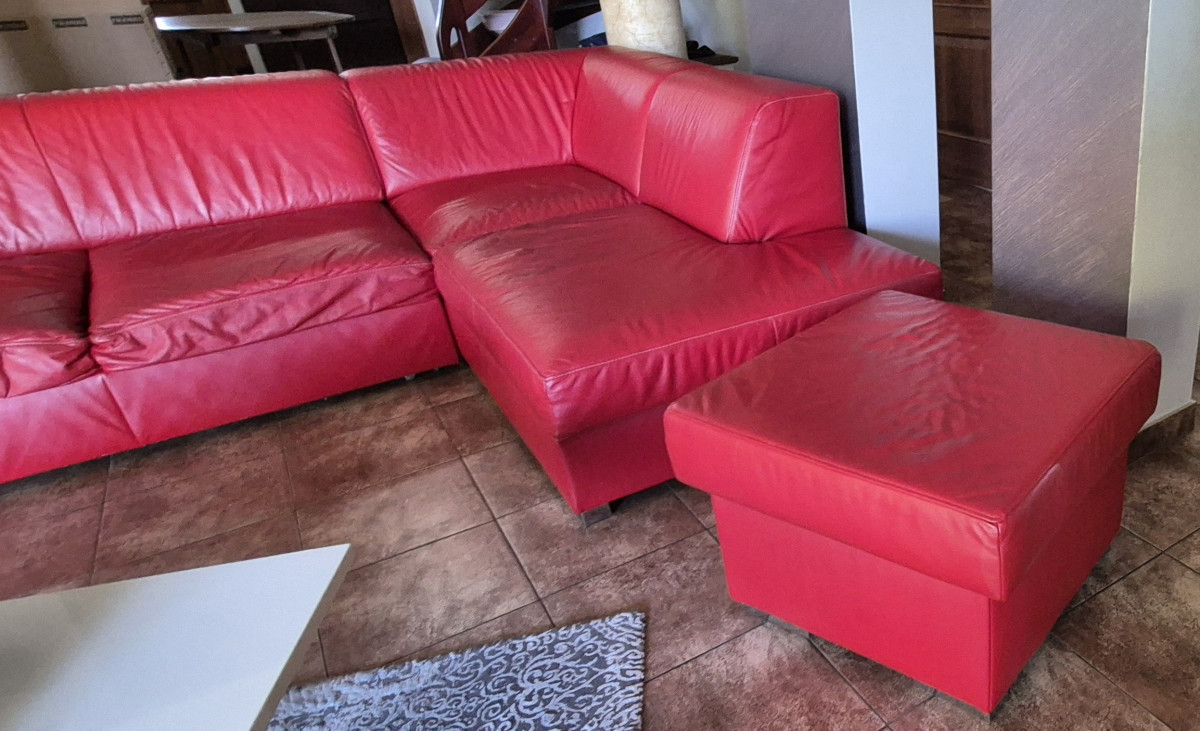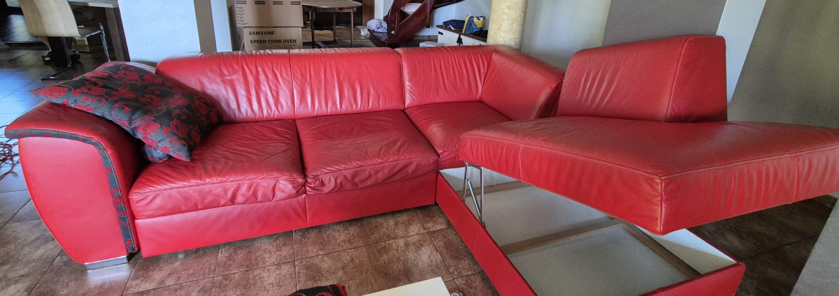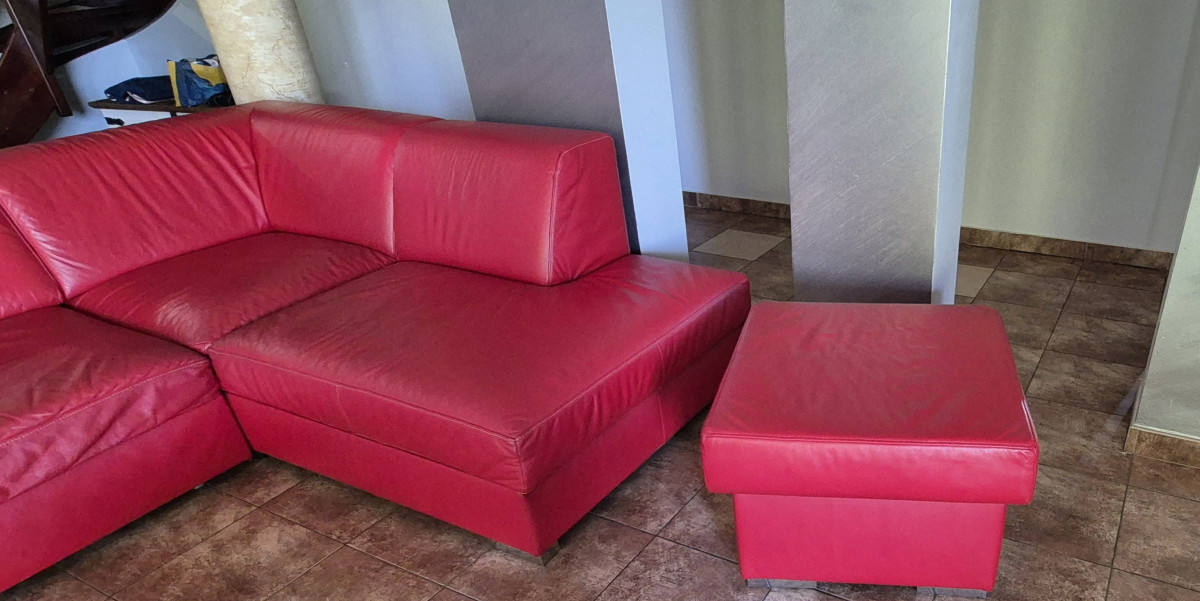 Sprzedam narożnik za skóry , kolor czerwony . Stan doobry .Wymiary 2,75 m x 2.10 m, wys.do siedziska 40 cm .Funkcja spania 1.40 x 2.10 . Skrzynia na pościel. Narożnik ma kilka przetarć na dole. W komplecie pufa 62 x 62 x 45 wys.