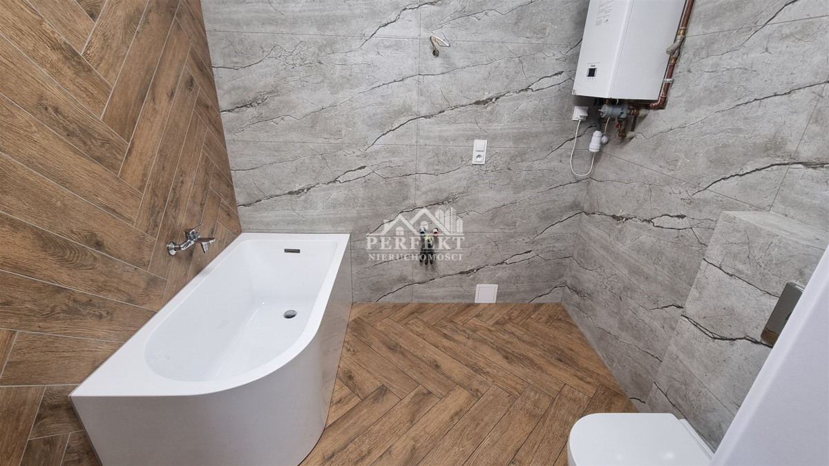 * reprezentacyjna łazienka w pełni wykończona z wanną, podwieszanym kompaktem i grzejnikiem z zasilaniem elektryczno-gazowym