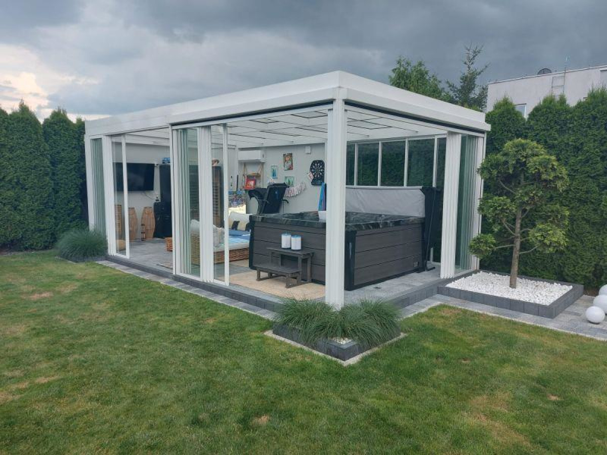 Na posesji znajduje się nowoczesny, aluminiowy budynek z roletami na pilota, w którym urządzono luksusowy zakątek wypoczynkowy.