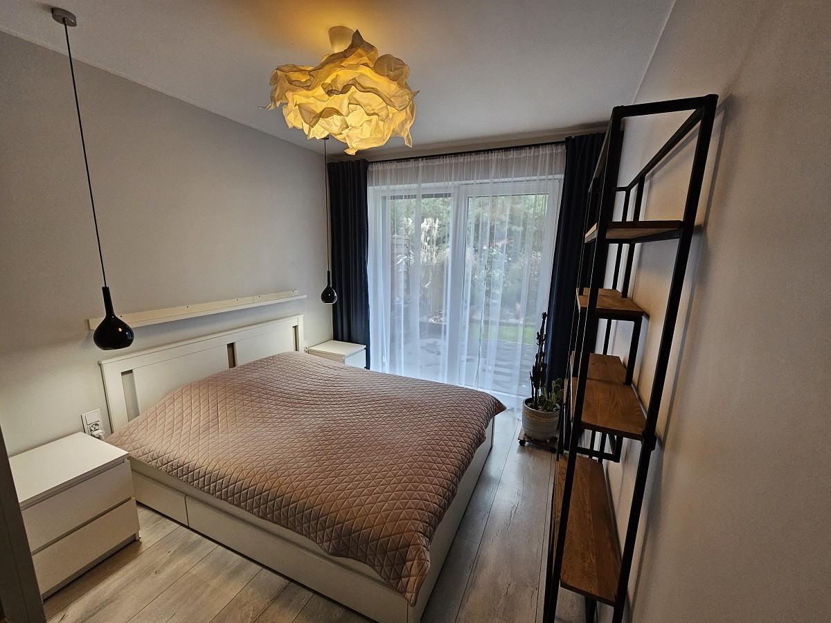 Dom składa się z salonu z wyjściem na taras i ogródek, dwóch sypialni, łazienki, pomieszczenia gospodarczego.