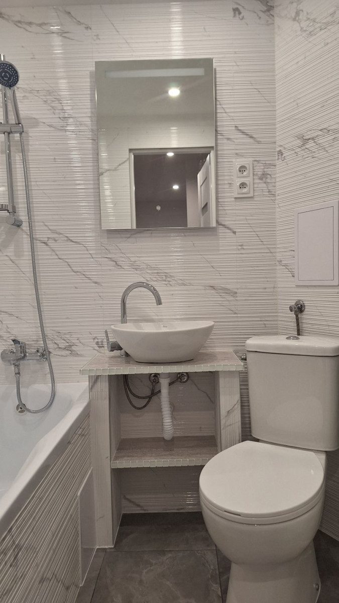 * w łazience: na ścianie płytki, na podłodze gres, nowa armatura,