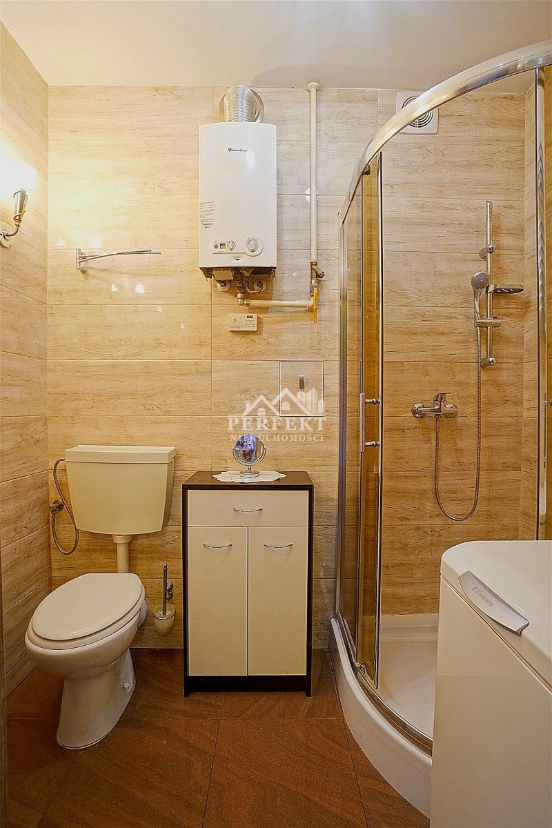 ▶ łazienka w glazurze z nową armaturą i podgrzewaczem wody typu Junkers