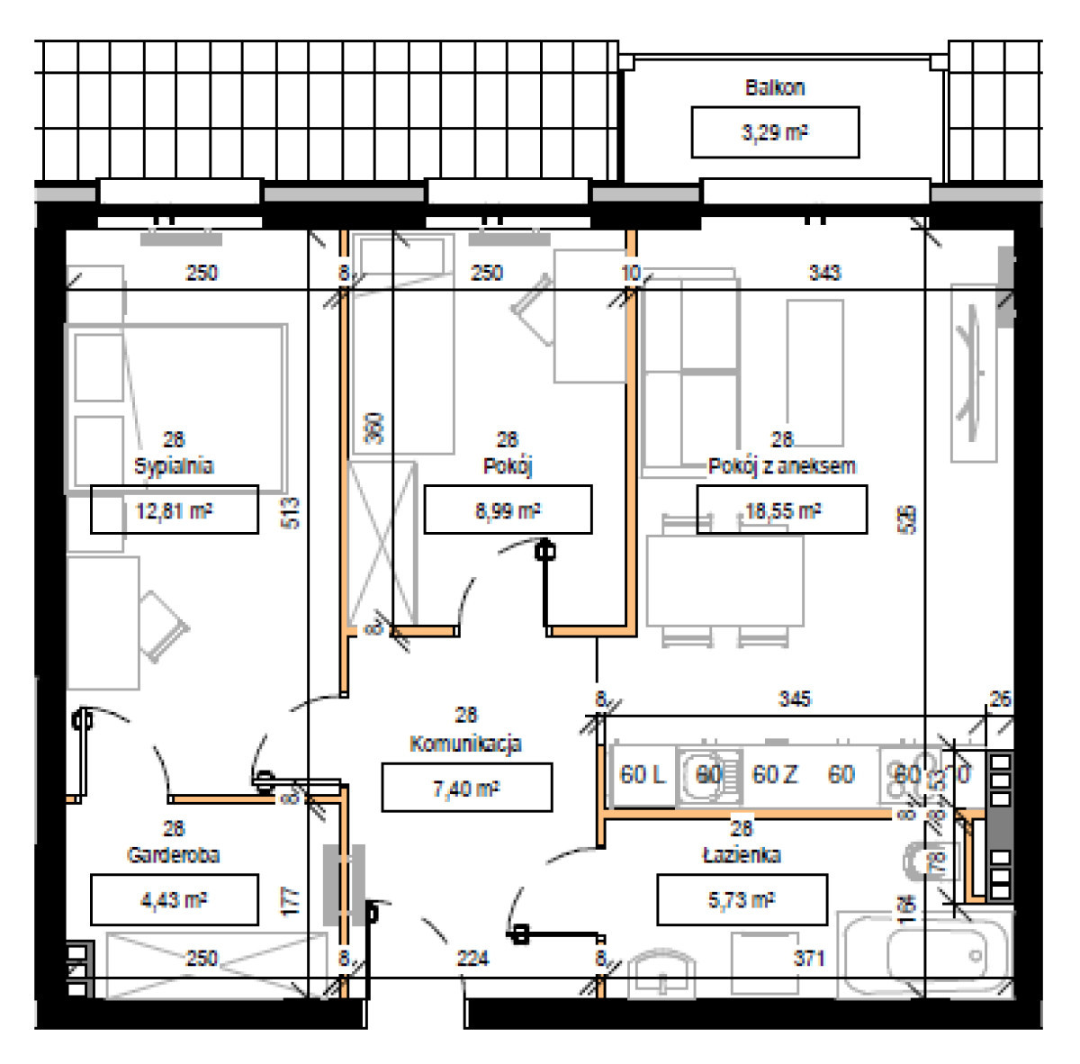 Pokój z aneksem 18.55 m2