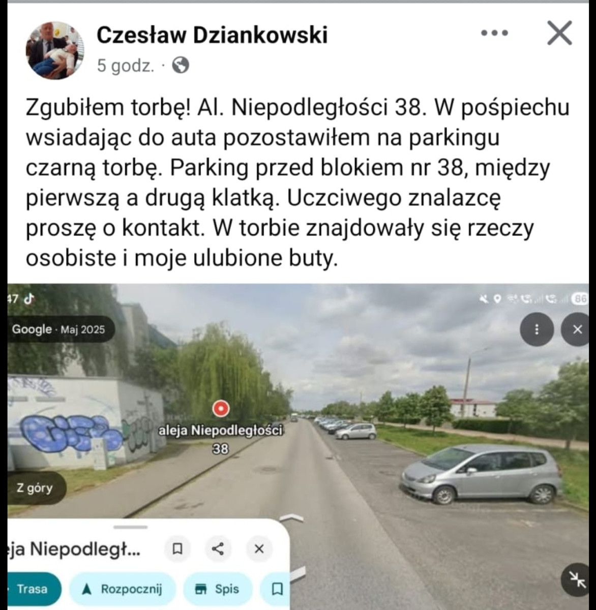 Zgubiłem torbę! Al. Niepodległości 38. W pośpiechu wsiadając do auta pozostawiłem na parkingu czarną torbę. Parking przed blokiem Niepodległości nr 38, między pierwszą a drugą klatką. Uczciwego znalazcę proszę o kontakt. W torbie znajdowały się rzeczy osobiste i moje ulubione buty.