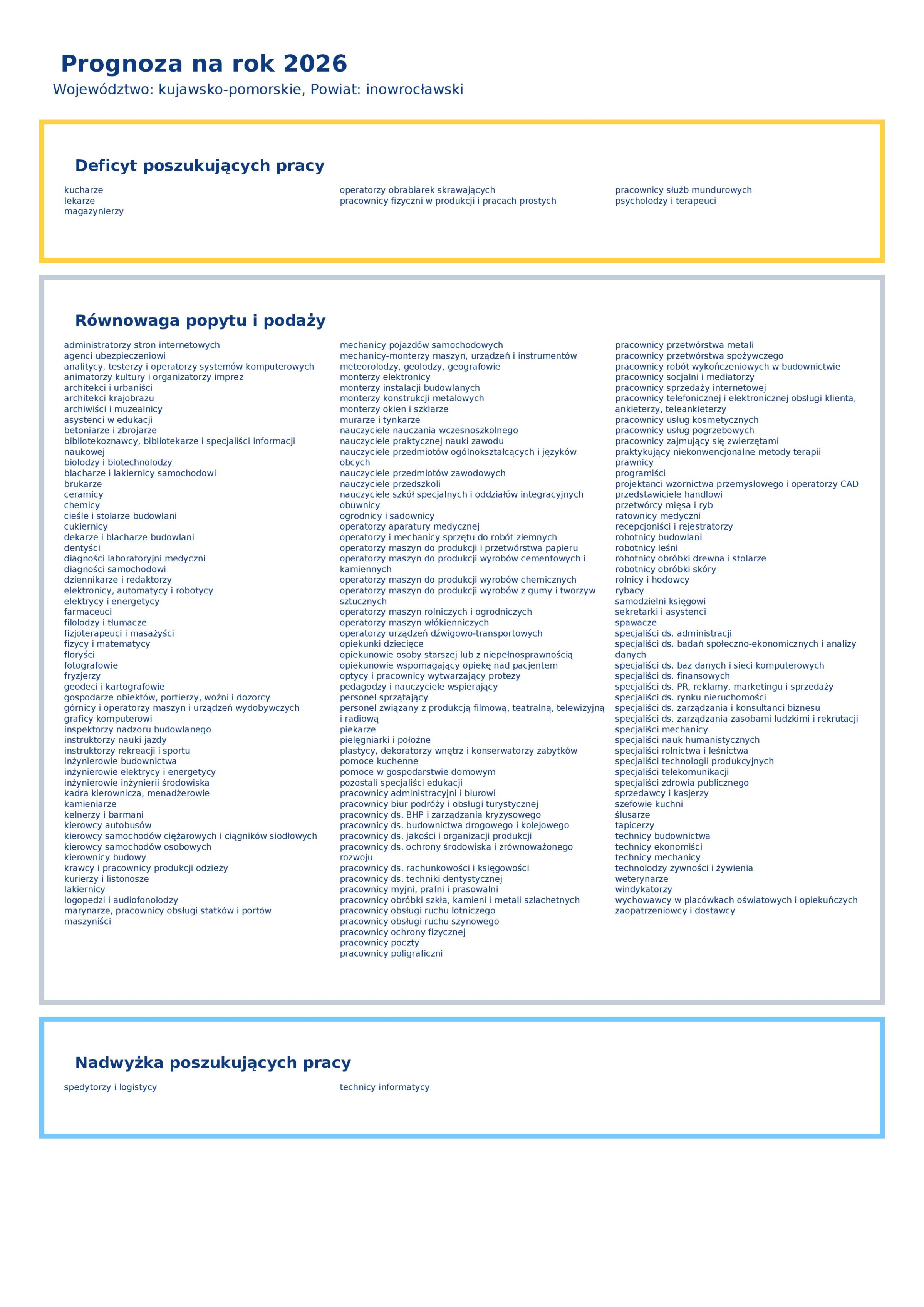 Dokument co roku przygotowuje Wojewódzki Urząd Pracy w Krakowie z podziałem na poszczególne powiaty. Dzieli w nim określone zawody na trzy kategorie: deficyt, równowaga i nadwyżka. Jak wynika z badania, najłatwiej w naszym powiecie będzie znaleźć pracę w zawodach kucharz, lekarz, magazynier, operator obrabiarek skrawających, pracownik fizyczny, pracownik służb mundurowych oraz psycholog i terapeuta. Najtrudniej pracę będzie znaleźć w zawodach spedytorzy i logistycy oraz technicy informatycy.